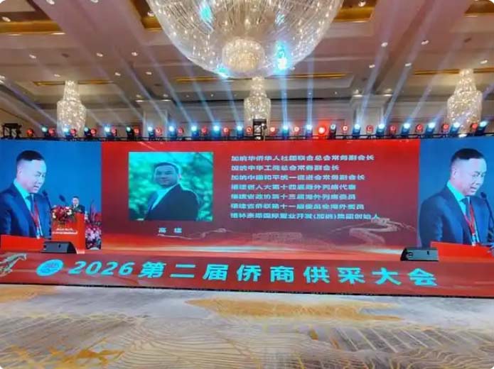 2026年2月28日,第二届侨商供采大会在福州中庚喜来登酒店成功举办。商务部驻福州副特派员陈霖,福建省人民政府顾问武评,福建省工商联副主席林龙金,福建省侨联副主席翁小杰,福建省工商联党组成员、秘书长施文彪,商务部驻福州特办处长胡国爱等领导参加本次大会;省商务厅、福州海关到会进行政策解读。林向荣、施洪清、陈建崇、高建、梁峰、王祖涛等世界侨商侨领发言,分析所在国营商环境及贸易与投资环境。中富通集团、福建省宏盛幸福石墨烯科技集团、奋安集团、福州大世界橄榄、良辰美文化传媒、福建闽高电力股份有限公司、仓山闽江海外发展服务中心等国内企业上台推介;香港倍佳集团分享企业出海经验。来自国内外企业800余人参加本次大会。